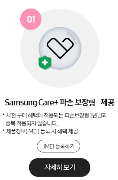 Samsung Care+ 파손보장형 1년권은 중복 적용되지 않습니다. 상세 내용은 My갤럭시클럽 페이지를 참고하세요.