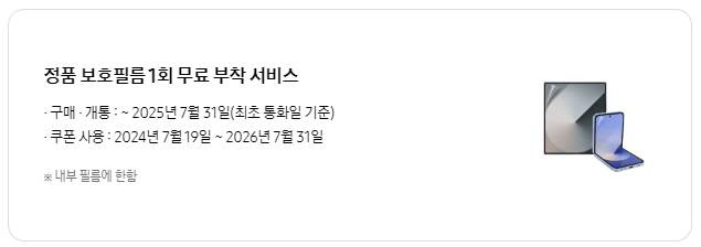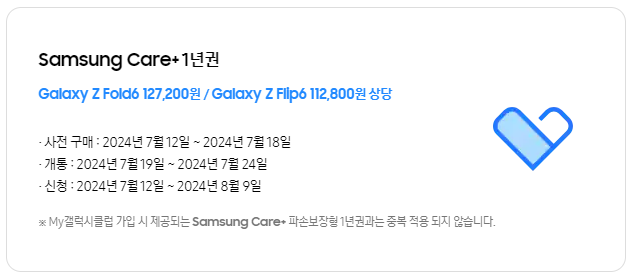 *Samsung Care+ 파손보장형 1년권 혜택은 Galaxy Z Fold6 l Z Flip6 사전 구매 혜택을 신청한 고객에 한해 개통 검증 완료 알림톡을 받으신 후 신청 정보가