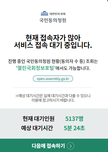 윤석열 대통령 탄핵 국회청원 사이트에 방문자가 폭주해 접속 대기가 길어지고 있습니다. 바쁘신 분들을 위해 대기없이 바로 탄핵국회청원이 가능한 링크 공유드리겠습니다. 아래 링크로 복잡한 대기 없이 1분만에 탄핵 국회청원을 완료하세요.