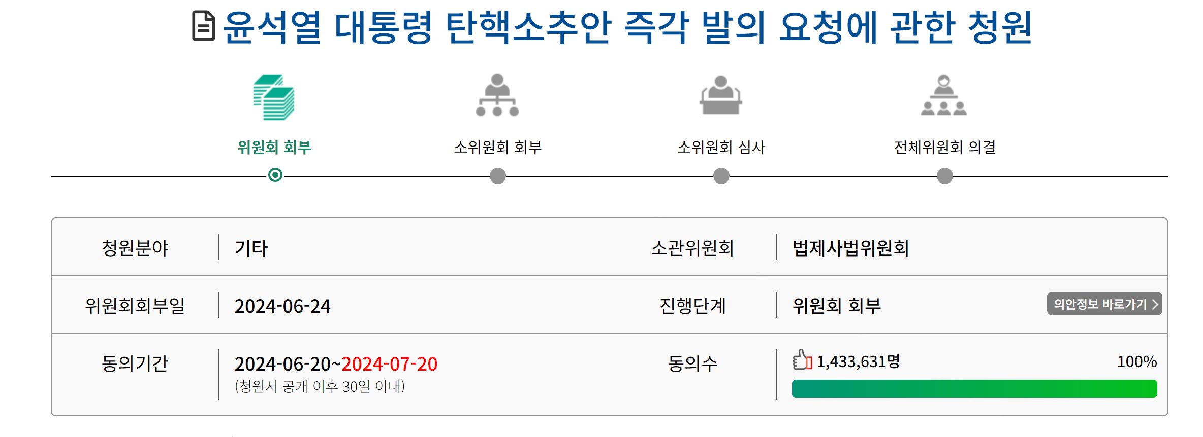 국회 국민동의 청원 제도는 홈페이지 공개 후 30일 이내에 동의 인원이 5만 명을 넘으면 관련 상임위에 상정되도록 되어 있습니다. 해당 청원은 이미 5만 명 이상의 동의를 받아 국회 법제사법위원회에 회부되었습니다.